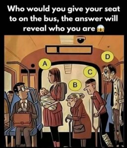 Imagine you’re on a crowded bus with one free seat remaining, and four people are visibly in need. Each person’s circumstances differ, and your choice could reveal distinct facets of your personality and values. Let’s examine each option: