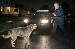 Headlights cut through the foggy evening, illuminating a trembling shape in the middle of the street. The air was cold, damp, heavy with the smell of rain and wet asphalt. A quiet residential block stood frozen — porch lights glowing, curtains half-drawn, neighbors holding their breath behind windows.