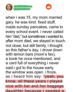 Wanting to honor him on Father’s Day, she drove for hours with a heartfelt card and gift. The card expressed all she’d never said — her gratitude, her belief that he had stepped up. But before she could surprise him, she overheard a phone call through his open window. Gary, laughing, confessed to never loving her mother, staying only for the house, and referring to her as “baggage.” The most devastating part: he had thrown away letters from her real father, who had tried to reach out for years.