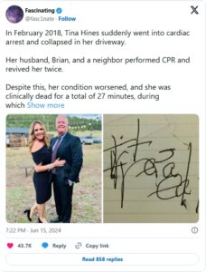 Tina isn’t alone. Stories like hers (often involving vivid visions, feelings of serenity, or encounters with loved ones or spiritual figures) are surprisingly common among those who have clinically died and been revived.