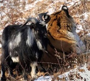 At Primorye Safari Park, located in Russia’s remote Far East, an extraordinary and heartwarming story began to unfold—one that defied the basic laws of nature and captured the attention of people worldwide. This incredible tale centers around two unlikely companions: a goat named Timur and a powerful Siberian tiger named Amur. The situation was, by all accounts, precarious. Timur, a small and vulnerable goat, was placed deliberately into Amur’s enclosure. Amur, a massive predator with years of experience hunting and surviving in the wild, was naturally expected to see Timur as nothing more than prey.