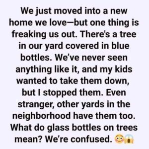 When we moved into our new home, we were thrilled—except for one strange thing. In our yard stood a tree covered in blue glass bottles. At first,…