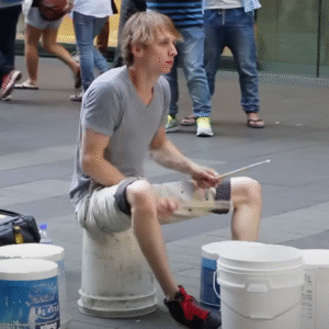 In a busy city street, a lone man sat quietly on an old, worn bucket, surrounded by a few more plastic pails arranged like a drum set….